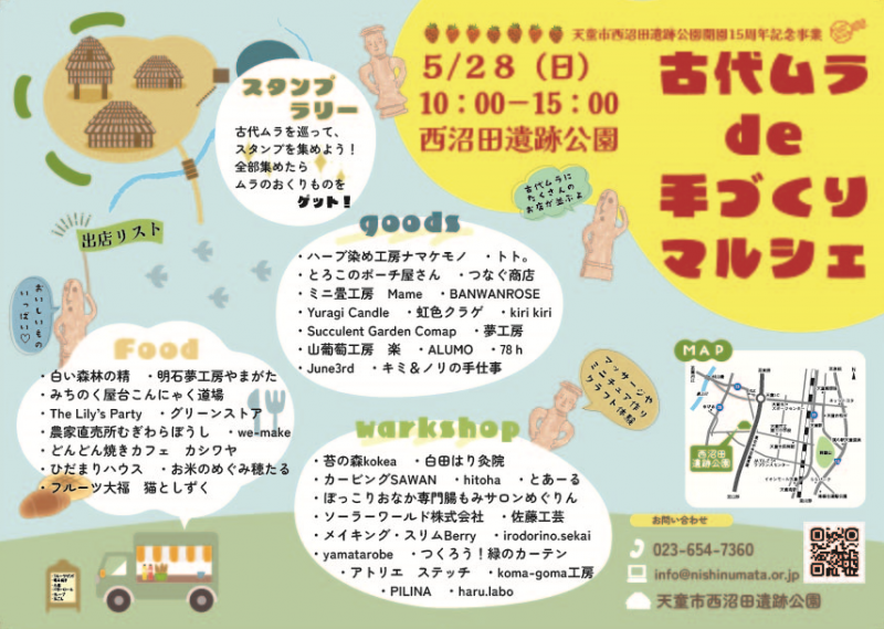 西沼田遺跡公園が2008年5月の開園から、今年で15年周年を迎えるのを記念し、マルシェを開催します と き  5月28日(日)10:00〜15:00 ※雨天決行、荒天中止 内 容  ★手作り雑貨やおいしいお菓子、ワークショップ、キッチンカーなど約40店舗が古代ムラに集まります。      ★古墳時代の復元住居などをめぐるスタンプラリーを開催します。参加者にはプレゼントがあります。 【おことわり】「ぽっこりおなか専門腸もみサロンめぐりん」出店中止となりました(5/5追記)「山葡萄工房 楽」に代わり「山葡萄工房」が出店することとなりました(5/19追記) お問い合わせーーーーーーーーーーーーーーーーーーーーーーーーーーーーーー天童市西沼田遺跡公園 023-654-7360 9:30〜18:00、月曜休園