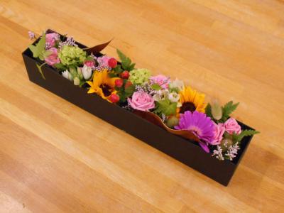 体験講座「母の日のボックスフラワーアレンジ」を開催しました。今年度も小原流一級家元教授の押野稚水先生による講座を4回計画しています。第一弾は、ちょうど母の日の開催。ボックスフラワーは、生け花とちがってバランスを見て空間を空けることを意識しなくてもいいので、自分の感性で隙間ができないように詰め混んでと先生。パパと参加した子供たちも多く、1時間ほどでママへの気持ちを箱いっぱいに詰め込んだボックスフラワーが出来上がりました。 実ものやドライの猫じゃらしのアクセントが効いています。箱にはふたがついていて、ちゃんと閉められるようにアレンジしました。細長い箱はロールケーキかな?と思ってしまいますが、開けたらびっくり、笑顔がこぼれること間違いなしです!!次回は6月11日のプリザーブドフラワーアレンジです。透明なグランドピアノ型の花器を使います。これもプレゼントにしてもよし、自宅に飾って長く楽しむのもよし、絶対におすすめの講座です!