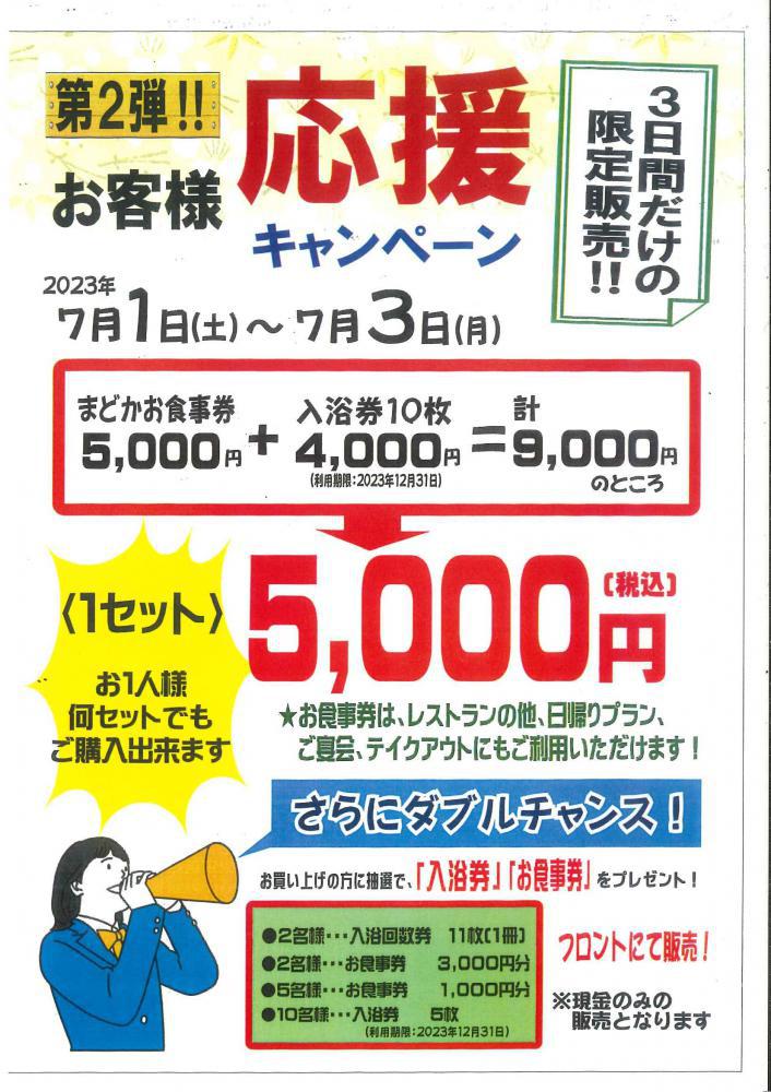 7月1日(土)〜7月3日(月)お客様応援キャンペーン第2弾 (お食事券+入浴券)特売!!3日間だけの特売!!まどかお食事券5000円+入浴券10枚(12/31利用期限付き)4,000円=9,000円のところ、5000円で販売!!※お一人様、何セットでも購入できます。フロントにて販売!!※お食事券は、レストラン、日帰り宴会、テイクアウトにも御利用できます。ぜひ、お求め下さいませ♪