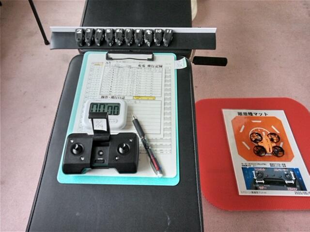 ドローン練習基地です。右に離着陸マット 腹筋台(黒いマット。実は腹筋台で少し傾斜している。)には、飛行記録の紙(バッテリー11個の充電時間と飛行時間記録)奥にバッテリー11個が置いてある。白いのがストップウォッチこれで毎回計測し、今現在累計で46時間49分48秒です。が、下手くそです。