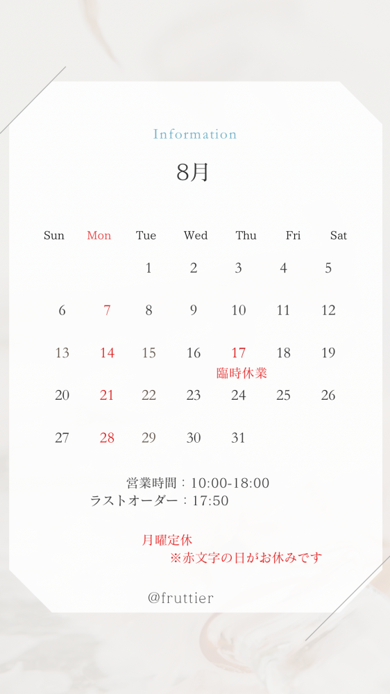 いつもフルッティアをご利用頂きましてありがとうございます。8月は月曜の定休日に加えて17日(木)を臨時休業とさせて頂きます。※お盆の8月14日(月)もお休みとなります。ご迷惑おかけしますが、どうぞよろしくお願いいたします。