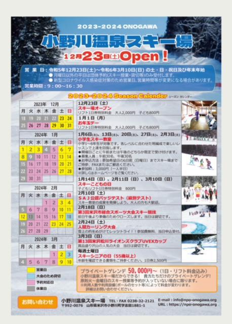 小野川温泉スキー場が12月23日(土)にオープンします。雪があればという前提が必要になりますが、年末年始、スキー場で楽しむことができたらいいな〜ゲレンデは一面だけでそんな難しいコースでなく、スキー、スノボもでき、ソリ遊びもできるゾーンがあるので、ファミリーやビギナー向けのスキー場です。スキーの後は温泉に入り、リフレッシュできるので、ぜひ、気軽に遊びにいらしてください〜  【公式】小野川温泉スキー場 | 【公式】小野川温泉スキー場 米沢の奥座敷、小野川温泉のスキー場へ (npo-onogawa.org)