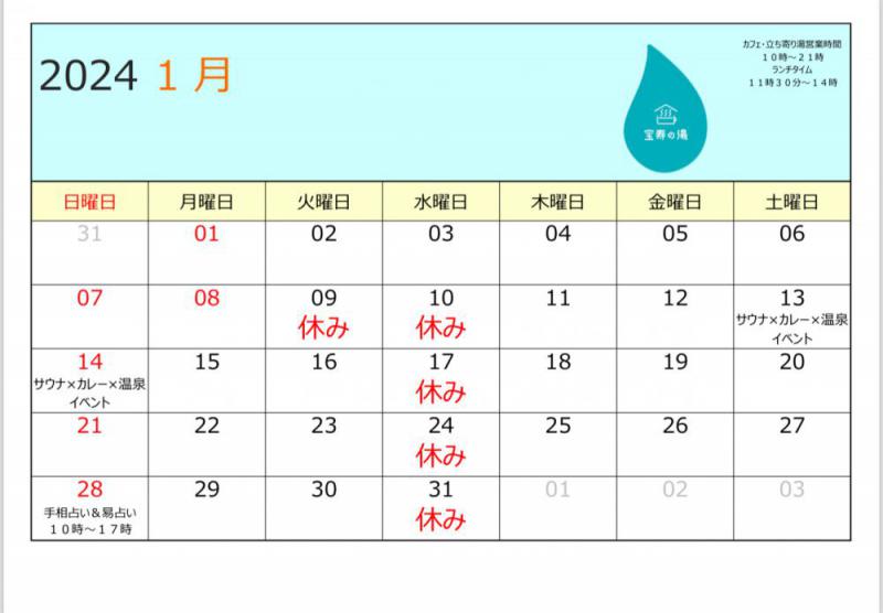 来年1月の営業カレンダーになります。1月3日は水曜日ですが、営業します。その代わりに9日(火)はお休みになりますので、お気をつけください。お待ちしております。