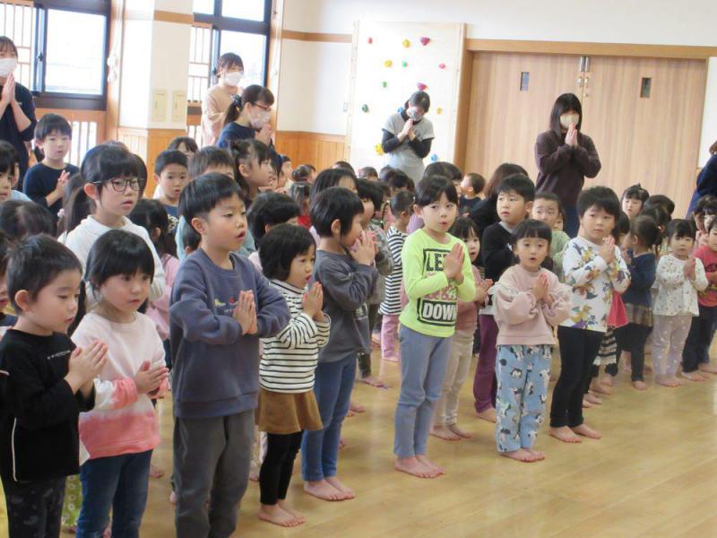 保育園ではお釈迦様に感謝の意味を込めて成道会を行います。お釈迦様は世界中の人々の幸福について悩み続けられ、6年間の厳しい修行を経て、12月8日夜明けの明星が光る時に、お悟りを開かれました。 “関興庵”窪副住職にお経をあげていただいた後に、子どもたちは“命の大切さ、感謝の気持ちをもつ、人にやさしくする”ことなどの教えを真剣な表情で聞いてました。