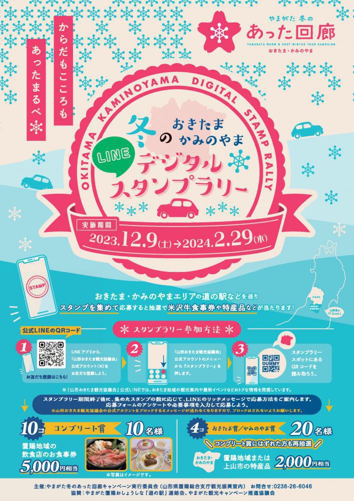 As you travel the Okitama region this winter, try out some digital stamp collecting fun for a chance to win some local specialty goods in a lucky draw! Event period: 9th December 2023 ~ 29th February 2024 (Thursday) How to Participate1. Use the LINE app to add the Yamagata Okitama Tourism Association account as a friend2. Open the tourism association account’s menu and click on Stamp Rally (スタンプラリー).3. Scan the QR codes at the applicable tourism spots4. After the event period has ended, you will receive a LINE message with instructions on how to register for the lucky draw depending on the number of stamps you have collected. Fill in required fields in the registration form and the survey to register.* Blocking the Yamagata Okitama Tourism Association account will prevent you from receiving the messages* Messages are sent in Japanese Completion Prize (10 stamps)Meal vouchers for restaurants in the Okitama region worth 5,000 yen – 10 winners Okitama Prize/Kaminoyama Prize (4 stamps)Okitama or Kaminoyama specialty goods worth 2,000 yen – 20 winnersThose who didn’t win the Completion Prize will also be included in the pool for these prizes! Stamp Rally Venues1. Michi no eki Yonezawa2. Michi no eki Tazawa nagomi no sato3. Michi no eki Kawa no minato Nagai4. icho café5. Michi no eki Takahata Mahoroba station6. Kawanishi Mori no Marche7. Michi no eki Shiroi Mori Oguni - Bunachaya8. Michi no eki Shiratakayana Park Mogami River Ayutopia9. Michi no eki Iide Mezami no sato Tourism Center10. Kaminoyama Onsen Tourism Information CenterFor more details, please check the Yamagata Warm and Cozy Winter Campaign page ContactYamagata Warm and Cozy Winter Campaign Organisation Committee (Okitama Regional Office Tourism Promotion Office)TEL: 0238-26-6046