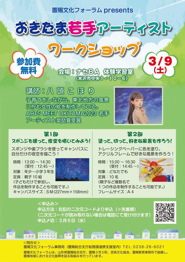 ナセBA体験学習室にて、「おきたま若手アーティストワークショップ」を開催します。ARTS MEET OKITAMA 2023若手アーティスト奨励賞受賞者の八頭こほり氏を講師に、第1部、第2部の2部構成で、アクリル絵の具を使ったワークショップを行います。キャンバスに夜空を描く、アクリルフレームで好きな風景を作成するなど、自分だけの作品を制作する機会となります。ぜひ、ご参加ください。<会場>ナセBA体験学習室(米沢市中央1−10−6)<参加費>無料<第1部 スポンジを使って、夜空を描いてみよう!> ※第1部は定員に達しました。日時:令和6年3月9日(土)13:00〜14:30(受付:12:45)内容:スポンジなど、身近なものを使ってキャンバスに夜空を描きます。対象:年少から小学3年生まで定員:親子10組(子どもだけで参加し、作品を制作することも可能)<第2部 塗って、切って、好きな風景を作ろう!>日時:令和6年3月9日(土)15:00〜16:30(受付:14:45)内容:トレーシングペーパーに色を塗り、アクリルフレームで風景を作ります。対象:どなたでも定員:10名(親子など複数名で参加し、1つの作品を制作することも可能)【申込方法】下記申込みフォームより、お申込みください。先着順となります。申込みフォーム詳細はコチラ