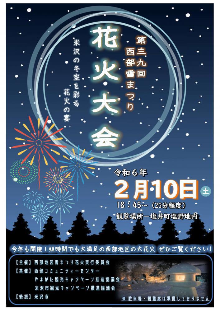 Fireworks will be launched in commemoration of the 39th Seibu Snow Festival! Feel free to stop by and have a look! Date: 10th February 2024 (Saturday)Launch Time: Around 6:45 pm, lasting 25 minutes The fireworks are visible in the Shiono area of Shioimachi, Yonezawa city.* Please note that parking space and seating will not prepared. Contact: Seibu Community CenterTEL: 0238-22-5758Operating hours: 9:00 am ~ 5:00 pm