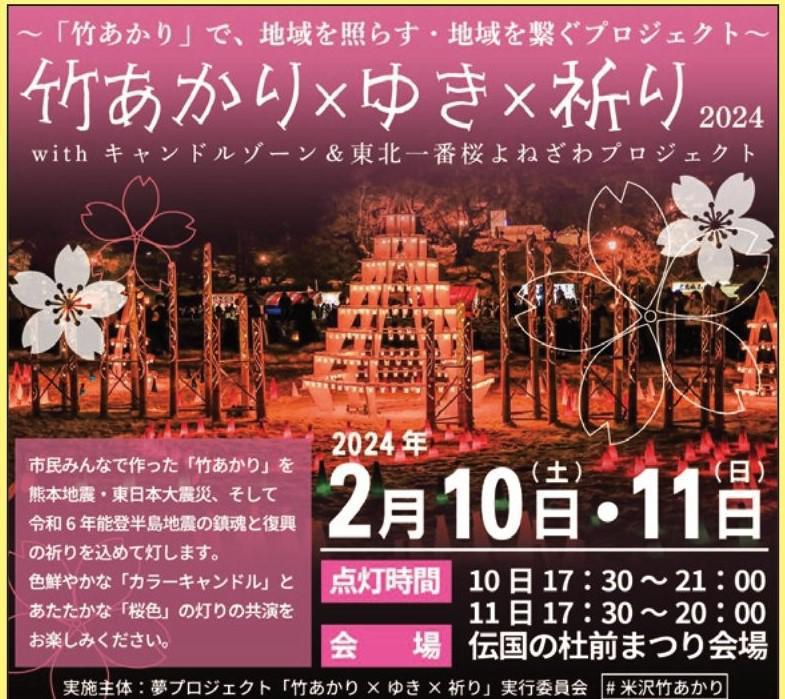The Takeakari x Snow x Wish 2024 with Candle Zone & Tohoku Number One Sakura Yonezawa Project will be held in conjunction with Uesugi Snow Lantern Festival!The collaborative takeakari bamboo lamps will be lit up in remembrance of the victims of the 2016 Kumamoto earthquake, the 2011 Tohoku earthquake, and the recent 2024 Noto earthquake. Enjoy the vibrant Candle Zone and the sakura pink bamboo lights when you come over! Candle Zone x Takeakari Light up Dates and Times 10th February (Saturday) – 5:30 pm ~ 9:00 pm11th February (Sunday) – 5:30 pm ~ 8:00 pm Location Denkoku no Mori Open Field For more information, check here.Uesugi Snow Lantern Festival official website (Japanese)