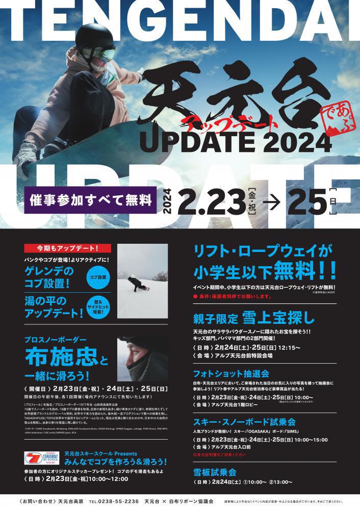 Tengendai’s sending an update for the long weekend from 23rd to 25th February! During this period, children up to elementary school age can ride the ropeway and lifts for free, and there are many other free activities you can check out while you’re here! Campaign Period 23rd February 2024 (Friday, national holiday) ~ 25th February 2024 (Sunday) Yunohira Course Update!New banked slaloms! New moguls! Perfect for a more active experience! Snowboard with a pro - Fuse Tadashi!On each day, an announcement will be made before the session starts. Two sessions are held per day - 1 in the morning and the other in the afternoon. Free entry for children up to elementary school age on the ropeway and lifts!Please ensure that your child is accompanied by a parent or guardian. The regular fee is 3,900 yen. Treasure Hunt for the Family! Find the Treasure Hidden in the Powder Snow!Includes both a Kids category and a Parents category! Dates: 24th February (Saturday) and 25th February (Sunday)Time: 12:15 pm onwardsVenue: Special Corner in front of Alb Tengendai Photo Lotto! Snap a shot when you visit and stand to win all sorts of prizes like lift vouchers and a stay at Alb Tengendai!Dates: 23rd February ~ 25th FebruaryTime: 10:00 am onwardsVenue: Alb Tengendai 1F Lobby Information about other events are available on the Tengendai website. Contact Tengendai 〒992-1461Shirabu Onsen Tengendai, Yonezawa-shiTEL: 0238-55-2236