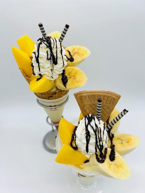 マンゴー&バナナ、南国のフルーツを掛け合わせたら・・・という訳でパフェを作ってみました。[おいしいけど、改良の余地あり!」でもどう改良したらいいか。。。思案中です。みなさまの前にお目見えする日が来るように____がんばります!!
