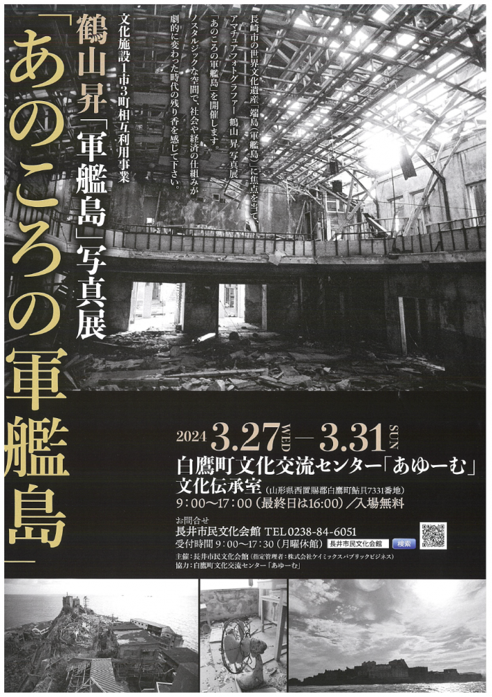 白鷹町文化交流センター「あゆーむ」にて、「鶴山昇「軍艦島」写真展」が開催されます。長崎市の世界文化遺産「端島(軍艦島)」に焦点を当て、アマチュアフォトグラファー鶴山昇の写真を展示します。この機会にぜひ、ご来場ください。<日時>令和6年3月27日(水)〜31日(日)9:00〜17:00(最終日は16:00)<場所>白鷹町文化交流センター「あゆーむ」文化伝承室<入場料>無料<問い合わせ>長井市民文化会館 0238−84−6051詳細はコチラ