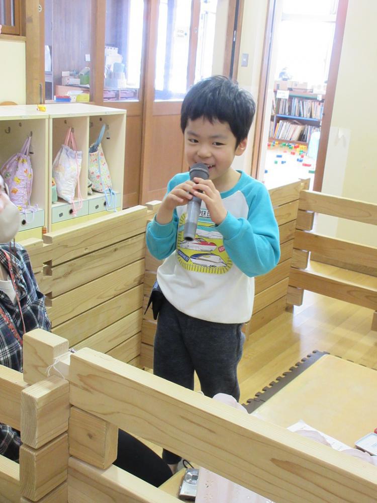 3月1日に、ひなまつり誕生会が行われました。今月の誕生児は3名でした。誕生児はみんなの前でドキドキしながらも、リズム運動の「うさぎ」や、鉄棒を披露してくれました。保育者の出し物の準備中は、会場準備をしてくれたすみれ組のお友だちが、手あそび『くっついた』やクラスで流行っている創作ダンスで盛り上げてくれました。保育者の出し物は『おひなさまに化けたたぬき』のペープサートでした。たぬきがひなあられを盗み食いすると「あーたべちゃだめー。」と言ったり、お雛様に化けたたぬきが出てくると「だまされないでー、それたぬきだよ。」と言ってみたり、お話に夢中になっていた子どもたちでした。