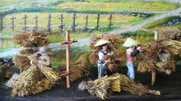ART MEET OKITAMA2024に向けての作品つくり、今年は、昭和30年代前半までの田園風景を作成しました。小学校低学年までは昔ながらの生活で稲刈りは手植え、手刈、そして天日干しの杭掛けの風景がみれましたね、牛や馬も農耕用に飼っていたとこもまだ残っていて、田んぼにはタニシからトンボもたくさんいましたが30年代後半から日本は高度成長となり、耕運機や稲刈り機械と急激な変化をみて育ちました。定年を迎え、米沢に移住して数年間、手植えに、杭掛けとお遊びですが友人となった農家さんのとこでやってみましたけど・・なるほど大変な作業でした・・杭を立てる穴を鉄棒で掘る作業、そして、杭立てるて稲を止める横棒を杭にとめる・・苦労がわかりましたね