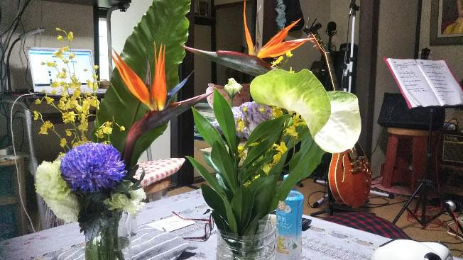 1日から6日まで東京に行っとりましたぁー・・・。毎年、5月連休は町田の国際版画美術館で相模原市に住んでいた頃からの油絵サークル”どんぐり”のグループ展に参加です。会の取りまとめの奥さんが花屋さんであり、毎年入り口に、立派な花を飾ります。その花は展示会終了時に会員みんなで分けて持ち帰り・・昨日絵画展を終了しそのまま帰宅、昨晩のうちに帰りました、家開けていたんで今朝から掃除に、洗濯、そしてメインの畑仕事が待ってます・・あいにくの小雨ですがこれから頑張ります。さて今回はストレリチアの花、ツインで持ち帰りました・・この花は、南アフリカを原産とするゴクラクチョウ科の植物です。大きくて厚みのある葉と、オレンジ色の苞(ほう:花の根元に着く小さな葉のこと)が特長、南国の鳥のように美しいことから、花の形を伝説上の生物に例えた「極楽鳥花」という別名を持つストレリチア。勢いよく伸びる茎についた大きな楕円形の葉が特徴です。ツインで並べると生きてる鳥のようです