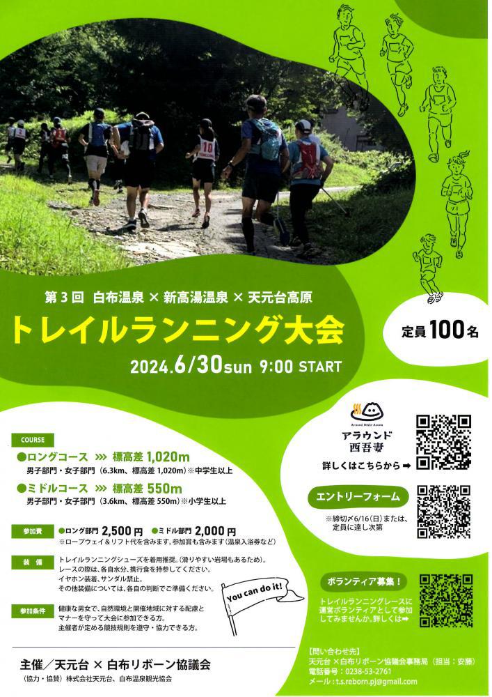 西吾妻山の大自然を駆け上るバーティカルレース!西吾妻山の玄関口である「天元台・白布温泉・新高湯温泉(通称:アラウンド西吾妻)」を舞台に、国立公園内の自然の中を駆け抜ける!温泉街の遊歩道から西吾妻山登山道、そして天元台高原ゲレンデという変化に富んだ標高差1020mのオリジナルコースにぜひ挑戦してください!トレラン初心者、お子様でも参加可能なミドルコースもあります。みなさんのご参加をお待ちしています!! ◇開催日時 2024年6月30日(日) 7:30〜受付開始(場所:湯元駅)◇部 門 ロングコース:男子部門・女子部門(6.3km・標高差1,020m)※中学生以上 ミドルコース:男子部門・女子部門(3.6km・標高差550m) ※小学生以上◇参加費 ロングコース 2,500円 ミドルコース 2,000円※ロープウェイ・リフト代、参加賞(温泉入浴券)含む。※参加申し込み、詳細はこちらをご覧ください。 ◇お問い合わせ先天元台×白布リボーン協議会事務局(担当:安藤)電話番号:0238-53-2761メール: t.s.reborn.pj@gmail.com