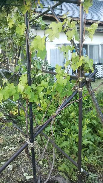 我が家の家庭菜園ブドウは、デラウエアとキャンベルアーリーの2種、マスカットは植えた年に枯れてしまいましたが、2本は元気に育ってます・・ようやくつるの剪定、固定、誘導を行いました、ブドウの花や果房のつき方は、前年に伸びた枝のわき芽が春に動き出し、新梢が伸びます。花はこの新梢の基部から数えて4〜6節の葉腋に花(果)房となってつきます。この新梢の伸び具合を観察しながら、芽かきをしていきます、果粒を大きくするためには、開花直前からハサミを使って房を切り込み、房づくりをしていかないとです、結実が確認できたら、1房の果粒数を調整していくのです・・果粒の数は、品種によって異なりますが、大粒品種では30〜35粒、中粒のマスカット・ベリーAでは60〜70粒、デラウエアでは90〜100粒ぐらいだそうです、果実のならせすぎは、果実品質や樹勢の低下を招くので、思い切り摘房、摘粒を行なうのがいいようですけども・・ここまではやりません・・あとはできたとこしだい・・家の南面に芝を植えて、畑と芝生の境界に土手をつくり、庭木を植えた。目隠し用に植えた花桃にサクランボの木は3年目で枯れてしまいました、この場所が、粘土質であり水はけが悪いところで水はけのよい土を好む気は向かなかったようです、目隠しの木の代わりにブドウ棚を畑側に追加してブドウ棚で目隠し用に植えて5年ほど経ちました・・キャンベルアーリーとデラウエア側はそこそこ目隠しの役になりそうに育ちました、昨年までは黒ネットを張って目隠ししてましたが、今年はなしで・・・南面の棚は植えたブドウが枯れて、再度土つくりしてから植えないといけない・・今のところ時間もなく黒ネットで目隠し代用してましたが、今年は畑側にキュウリ、インゲン、さやえんどうで目隠しすることに、芝生側に立って目隠しに空きがあるところは追加でゴーヤも植えます・・・