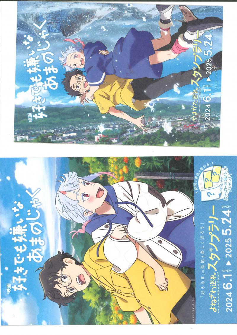 好きでも嫌いなあまのじゃくスタンプラリー!有料版1000円 無料版 2種類同時開催!「好きあま」の聖地を楽しく巡ろう!映画「好きでも嫌いなあまのじゃく」は山形県米沢市が舞台です。柊とツムギが旅した実際のロケ地を楽しく巡れるスタンプラリーは2種類!無料版は米沢エリア、有料版は米沢・上山・山形エリアを巡ります。無料版・有料版それぞれ、季節ごとに2〜3種類の景品をプレゼント。山形県は四季がはっきりしていて、季節によって全く違う風景やグルメが楽しめます。何度でも山形を訪れてスタンプラリーに参加し、オリジナルグッズを全部GETしてください!詳しくは好きあまよねざわ応援隊ホームページをご覧ください!有料版スタンプラリー 1冊1000円https://travelyonezawa.com/amanojaku-movie/stamprally-yamagata.html無料版スタンプラリーhttps://travelyonezawa.com/amanojaku-movie/stamprally-yonezawa.html