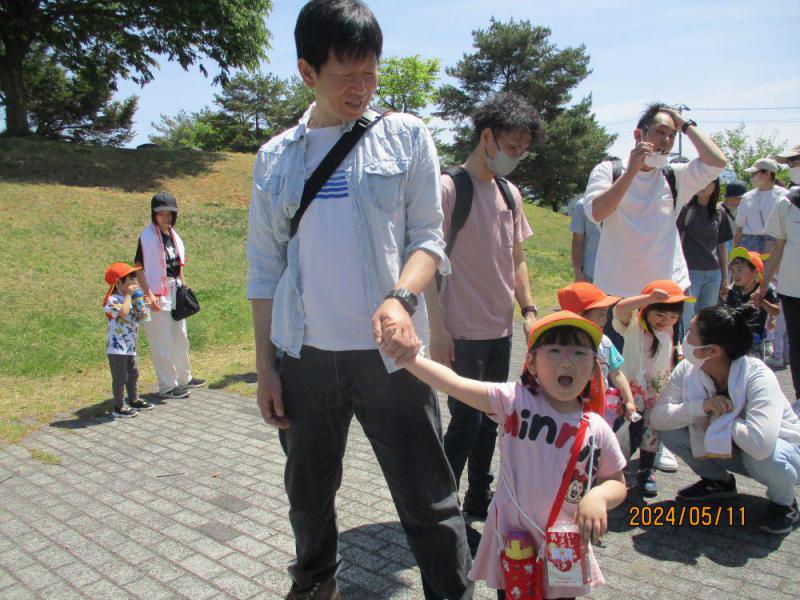 5月11日(土)年少組の保育参加を行いました。いつも遊び慣れている総合公園までの道のりは、大好きなお家の方と一緒ということで、嬉しさがあふれ笑顔いっぱいの子ども達でした。公園に着くと早速大好きな虫やカエル探しを始める子や、草花や木の実を見つけて嬉しそうにお家の方に見せていました。