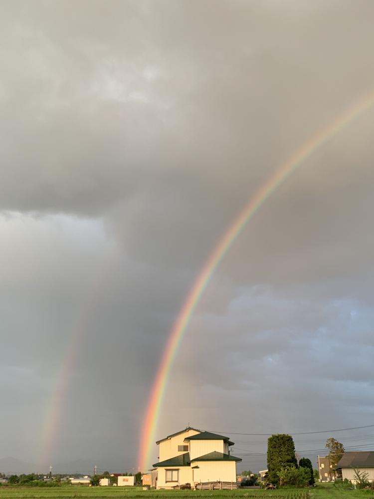 茄子畑で作業中、立ち上がってびっくり!!目の前にとんでもなく大きな虹あんまり近いので、ずっと移動してこのくらい撮れた。実際には感動の美しさだった!