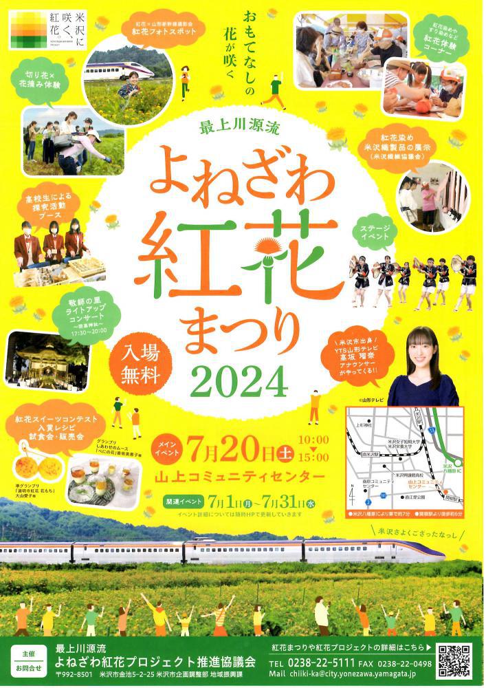 「最上川源流 よねざわ紅花まつり」のメインイベントが7月20日(土)に開催されます!紅花体験コーナー、ステージイベント、キッチンカー、ライトアップコンサートなど、様々なイベント盛りだくさんです!ご来場者には、オリジナルうちわをプレゼント!また、関連イベントも7月1日(月)〜7月31日(水)まで開催されます。この機会に紅花にふれてみませんか?みなさんのお越しをお待ちしています!! ◇メインイベント開催日 2024年7月20日(土)◆山上コミュニティセンターエリア 10:00〜15:00@紅花体験コーナーA紅花畑オーナー企画ブースB高校生による探究活動紹介ブースC紅花スイーツコンテスト入賞作品試食会&販売会D山上コミュニティセンター屋内イベントE販売コーナーFキッチンカーGミニ新幹線がやってくる!H昔遊びコーナーIアマチュア無線体験Jステージイベント◆紅花畑エリア 場所:山形新幹線線路沿い 10:00〜15:00@紅花×山形新幹線 写真撮影会A切り花×花摘み体験◆羽黒神社 17:30〜20:00・敬師の里ライトアップコンサート 詳細はチラシ(関連イベント)、チラシ(メインイベント)をご覧ください。 【お問い合わせ】最上川源流よねざわ紅花プロジェクト推進協議会 TEL:0238-22-5111