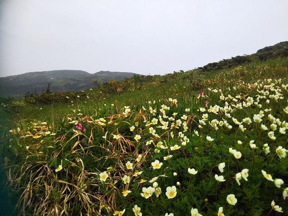 吾妻連峰の人形石から東側に少し行くと、小凹(こくぼ)と呼ぶ、高層湿原の花畑がある、そこに咲くチングルマ、この花は、本州中部以北、北海道、千島、樺太、アリューシャンにかけて分布する矮小灌木です。花が終わると長い毛のあるタネが実ります。この長く伸びた毛が風にそよぐさまを稚児の風車に見立ててチングルマと名づけられたといわれています。