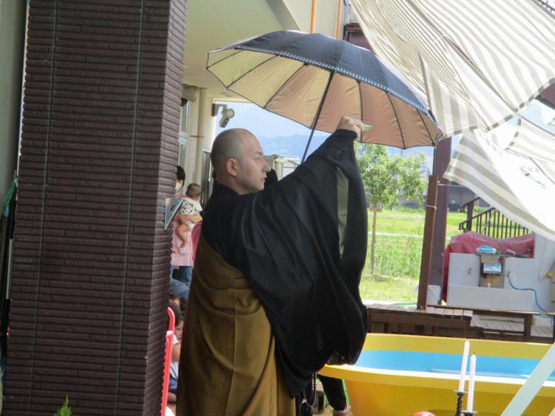 6月19日にプール開きが行われました。今年も安全にプール、水遊びを楽しむことができるように昌伝庵、今成副住職様より安全祈願していただきました。お経が始まると、小さな手を合わせて真剣な表情を見せていた子どもたちです。その後、代表の子どもたちがプールに塩をまきお清めをしました。「今年も事故なく楽しく安全に水遊びができますように!