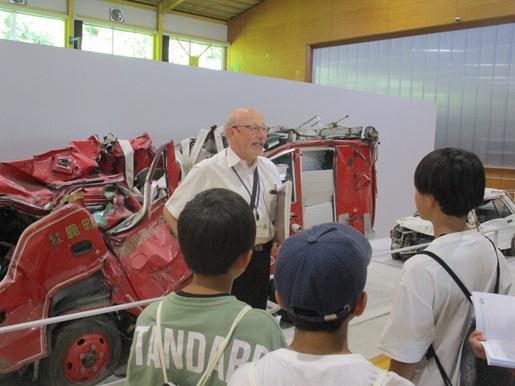 石巻市震災遺構 門脇小学校 見学です。 説明して下さったのは、館長のリチャード・ハルバーシュタットさん。彼は、以前鶴岡市のALT.その後、イギリスに帰ったのですが、日本のことが好きで、石巻専修大学で教えていました。そこで震災に遭ったのです。日本の友達からいろいろと助けてもらったから、石巻に残って震災のことを伝えようと決めたのだそうです。熱く熱く語ってくださいました。 あの大震災は、6年生が生まれる前の出来事になってしまいましたが、みんな真剣に聞いていました。 石巻市は、太平洋に囲まれているところなので、一番被害が大きかった所。 この写真の青い矢印が津波です。 この門脇小学校は、このラインまでしか水は来ませんでした。子どもたちは、津波の訓練をしていたので、上級生が下級生をおんぶしたりして学校にいた児童はすべて助かったそうです。でも、下校時刻が早かった1・2年生の中には、命を落としてしまった人もいたそうです。 これは、津波が運んできた暖房の火と思われるものが、学校まで流れてきて2階3階が焼けた跡です。凄まじい火事の跡だということが、一目でわかりました。これは、廊下。教室の戸は、すべて焼け落ちていました。 これは、体育館の床の泥です。地域の方が避難した場所。また、お家の方に児童の逃げ場所を伝えるために残っていた教職員もいました。地震の後、1時間ほどして襲ってきた津波や火事から逃げるために・・・ なんと、みんなで知恵を出し合い、思いついたのは、この教壇。これを橋にして校舎から裏山へ続く道に逃げたのだそうです。しかも、この重い教壇を一人で運んだのだとか。1階にいた方も、今度は、これを「はしご」にして裏山へ這いあがったそうです。本当に「火事場のばか力」が出たと、あとで話していたそうです。襲ってくる津波、燃え盛る炎から逃げたことを考えると、ぞっとしてしまいます。 この言葉は、石巻の方々の思い。私たちは、決して2011年のことを忘れず、またこれを教訓にして大事な命を守らなければいけないと改めて思いました。 リチャード館長さん、ありがとうございました。館長さんの話は、6年生の心にしっかりと焼き付いたことでしょう。