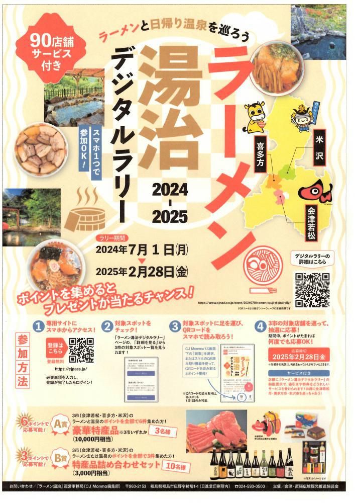 山形県米沢市、福島県会津若松市、喜多方市、の3市にある「ラーメン店」と「日帰り温泉施設」を巡って楽しむ『ラーメン湯治デジタルラリー2024-2025』がスタート!2025年2月28日(金)まで実施していますので、ぜひご参加ください!参加方法は、(1)専用サイト「CJ Monmoパス」に登録!(2)対象スポットに足を運び、QRコードをスマホで読み取るとポイントゲット!(3)ポイント数で抽選に応募!また、店舗に「ラーメン湯治デジタルラリー」の画面提示で、値引きや特典などうれしいサービスが受けられます!この機会に、お得に米沢市・会津若松市・喜多方市を巡ってみてはいかがですか。 ◇開催期間 2024年7月1日(月)〜2025年2月28日(金)◇会場名 米沢市・会津若松市・喜多方市の協賛各所◇賞 品 ・A賞(6ポイントで応募可能) 豪華特産品(10,000円相当)3名様 ・B賞(3ポイントで応募可能) 特産品詰め合わせセット 10名様 【お問合せ】「ラーメン湯治」運営事務局(CJ Monmo編集部) TEL:024-593-0500 ※詳しくはこちらをご覧ください。