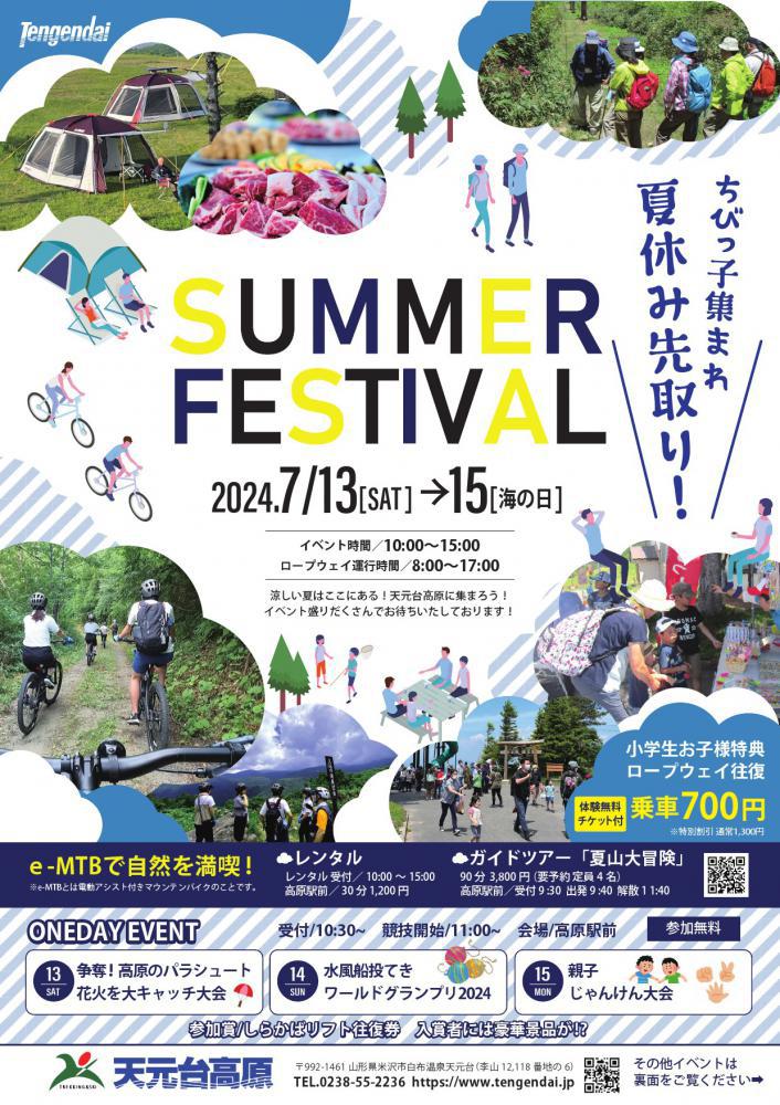 天元台高原では、7月13日(土)〜7月15日(月・海の日)の3日間、「サマーフェスティバル」を開催いたします。期間中は小学生のロープウェイ往復券が700円(体験チケット付き)に!その他、西吾妻山トレッキングツアー、新感覚ゴーカート、親子で高原宝さがしなど、いろいろなイベント盛りだくさんです!また、雲上テラスカフェでは新メニューが登場!ぜひ涼やかな天元台高原に遊びにいらしてください!! ◇開催日時 2024年7月13日(土)〜15日(祝・海の日)イベント時間/10:00〜15:00ロープウェイ運行時間/8:00〜17:00 【イベント内容】▽西吾妻山トレッキングツアー▽レンタルeMTB▽親子宝探し▽新感覚ゴーカート「EzyRoller」▽自由工作▽夏野菜販売▽Lineお友だちありがとう抽選会 ※その他のイベントなど詳しくは天元台高原ホームページをご覧ください。 【お問合せ】天元台高原〒992-1461 米沢市白布温泉天元台TEL:0238-55-2236 FAX:0238-55-2127