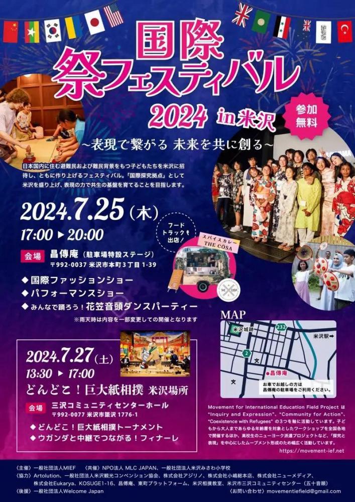 国際祭フェスティバル2024 in 米沢 〜表現でつながる 未来を共に創る〜日本国内に住む避難民および難民背景を持つ子供たちを招待し、共に祭りを作り上げる「国際祭フェスティバル2024 in 米沢」を開催します。米沢を国際探究の拠点とし、多様な文化の交流によって共生の基盤を育むことを目指しています。 日時:2024年7月25日(木) 17:00〜20:00会場:昌傳庵(しょうでんあん)駐車場特設ステージ(992-0037 米沢市本町3丁目1-39)〜イベント内容〜 参加無料!・国際ファッションショー・パフォーマンスショー・みんなで踊ろう!花笠音頭ダンスパーティー※雨天時には内容が一部変更となる場合があります。フードトラックも出店!このイベントは、文化の交流と共生を大切にする素敵な機会。みんなで楽しめる国際祭フェスティバル、ぜひ遊びに来てね! 別日に関連イベントも開催!主催:一般社団法人MIEF 〜関連イベント〜「どんどこ!巨大紙相撲 米沢場所」日時:2024年7月27日(土) 13:30〜17:00場所:三沢コミュニティセンターホール(992-0077 米沢市簗沢1776-1)・どんどこ! 巨大紙相撲トーナメント・ウガンダと中継でつながる!フィナーレ