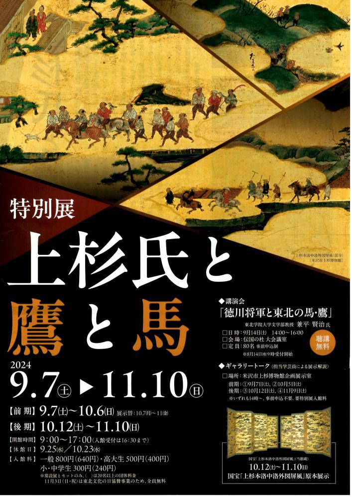 米沢市上杉博物館 特別展「上杉氏と鷹と馬」9/7(土)〜開催!鷹や馬は、古墳時代の形象埴輪にもみられるように、古来人々の生活の中に存在しましたが、特に権力と強く結びついていました。武士は、鷹狩のために優れた鷹を求め、また乗馬のための名馬を求めました。この展覧会では、鷹狩やさまざまな馬をめぐるシーンを描く洛中洛外図屏風、厩図屏風、鷹や馬に触れた国宝上杉家文書など、上杉家ゆかりの文化財を中心に鷹や馬を通した上杉氏の歴史を紹介します。◇開催期間 2024年9月7日(土)〜11月10日(日)【前期】9/7(土)〜10/6(日)展示替:10/7〜10/11【後期】10/12(土)〜11/10(日)◇開館時間 9:00〜17:00(入館受付は16:30まで)◇休館日 9/25(水)・10/23(水)◇入館料 一般800円(640円)・高大生500円(400円)・小中学生300円(240円)※常設展とセットのみ、( )内は20名以上の団体料金※11月3日(日・祝)は東北文化の日協賛事業のため、全員無料◇講演会「徳川家康と東北の馬・鷹」 ※聴講無料東北学院大学文学部教授 兼平 賢治氏・日時:9/14(土)14:00〜16:00・会場:伝国の杜 大会議室・定員:80名(事前申込制)※8/14(水)9時受付開始◇ギャラリートーク(担当学芸員による展示解説)・場所:米沢市上杉博物館企画展示室・前期:@9/7(土)A10/5(土)・後期:B10/12(土)C11/9(土)※いずれも14時〜、事前申込不要、要特別展入館料■10/12(土)〜11/10(日)国宝「上杉本洛中洛外図屏風」原本展示◇お問い合わせ米沢市上杉博物館 TEL:0238-26-8001〒992-0052 米沢市丸の内1-2-1