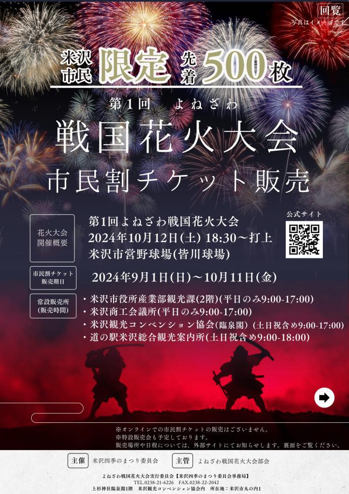 よねざわ戦国花火大会市民割チケット9/1(日)〜販売開始!(一般チケット販売8/10〜)大曲全国花火競技大会優秀賞内閣総理大臣賞受賞「イケブン」が送る最高のエンターテイメント!ぜひお得な市民割チケットをお求めになりご覧ください!◇花火大会開催概要第1回よねざわ戦国花火大会2024年10月12日(土)18:30〜打上米沢市営野球場(皆川球場)◇市民割チケット販売販売期日:2024年9月1日(日)〜10月11日(金)※米沢市民限定 先着500枚・謙信公シート(場内バックネット裏)350枚:1席1名 市民特別価格5,000円(一般販売価格8,000円)・兼続公シート(場内ペアシート)150枚:1シート2名 市民特別価格10,000円(一般販売価格16,000円) ◇常設販売所 ・米沢市役所産業部観光課(2階窓口5番)/平日のみ9:00〜17:00(販売時間) TEL:0238-22-5111 ・米沢商工会議所/平日のみ9:00〜17:00 TEL:0238-21-5111 ・米沢観光コンベンション協会(臨泉閣)/土日祝含め9:00〜17:00 TEL:0238-21-6226 ・道の駅米沢総合観光案内所/土日祝含め9:00〜18:00 TEL:0238-40-8400◇一般チケット販売販売期間:2024年8月10日(土)0:00 〜大会当日まで(先着順・売り切れ次第終了)チケットの購入方法チケットはインターネットでご購入いただけます。「チケットを購入する」ボタンから「イープラス」のチケット販売ページへ移動し購入手続きをおこなってください。※当日の会場でのチケット販売はありません。事前にインターネットからのご購入をお願いいたします。※チケットのご購入の前に注意事項を必ずご確認いただくようお願いいたします。※よねざわ戦国花火公式サイトはこちらから◇お問い合わせ よねざわ戦国花火大会実行委員会(米沢四季のまつり委員会事務局)TEL:0238-21-6226