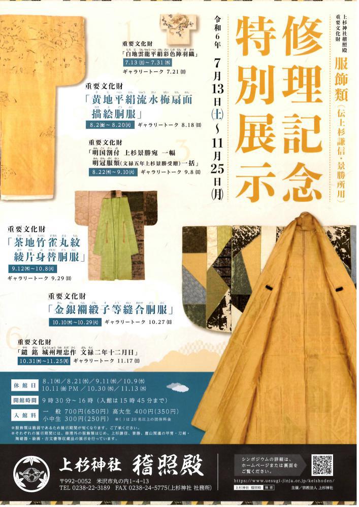 上杉神社 稽照殿では、7月13日〜11月25日の期間「重要文化財 服飾類(伝上杉謙信・景勝所用)修理記念 特別展示」を開催しております。この機会にぜひ、上杉神社稽照殿にお越しください。◇会期 7月13日(土)〜11月25日(月) ●T期 7月13日(土)〜7月31日(水)【重要文化財】白地雲龍平絹彩色陣羽織※終了しました。●U期 8月2日(金)〜8月20(火)【重要文化財】黄地平絹流水梅扇面描絵胴服●V期 8月22日(木)〜9月10日(火)【重要文化財】明国さっ付 上杉景勝宛 一幅 明冠服類(文禄五年上杉景勝受贈)一括 ※ギャラリートーク:9月8日(日)●W期 9月12日(木)〜10月8日(火)【重要文化財】茶地竹雀丸紋綾片身替胴服※ギャラリートーク:9月29日(日)●X期 10月10日(木)〜10月29日(火)【重要文化財】金銀襴緞子等縫合胴服※ギャラリートーク:10月27日(日)●Y期 10月31日(木)〜11月25日(月)【重要文化財】鑓 銘 城州埋忠作 文禄二年十二月日※ギャラリートーク:11月17日(日)※服飾類は脆弱であるため展示期間が短くなります。ご了承ください。※それぞれの展示期間には、修理外の服飾類はじめ、上杉謙信、景勝、鷹山関連の甲冑・刀剣・陶磁器・絵画・古文書等収蔵品の展示を行っています。◇会期中の休館日8/1(木)、8/21(水)、9/11(水)、10/9(水)、10/11(金)PM、10/30(水)、11/13(水)◇開館時間 9:30〜16:00(入館は15:45まで)◇入館料 一般700円(650円)高大生400円(350円)小中生300円(250円)※( )は20名以上の団体料金ギャラリートーク 開催日:9/8(日)、9/29(日)、10/27(日)、11/17(日) 開催時刻:いずれも14:00〜 参加費:無料(入館料はお支払いいただきます) 解説員:当館学芸員 角屋由美子 申 込:不要※なお、各回内容は同じ関連事業重要文化財 服飾類(伝上杉謙信・景勝所用)修理記念シンポジウムを開催します。内容につきましてはこちらをご覧ください。 ◇お問い合わせ上杉神社 稽照殿 TEL:0238-22-3189〒992-0052 米沢市丸の内1-4-13
