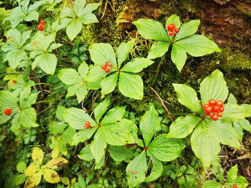 東吾妻山1975mの、南東側になる高山1805mに行って、登山道で見かけた花その2、”ゴゼンタチバナ”石川県の白山の御前峰で発見されたところから、「ゴゼン」と名前についているようです。葉の数は4 枚か6 枚ですが、花が咲くのは必ず葉が6 枚。4 枚のものには来年花が咲くらしい。花は白い花で天元台で撮ったのを紹介しましたが、秋になると赤い実がつく