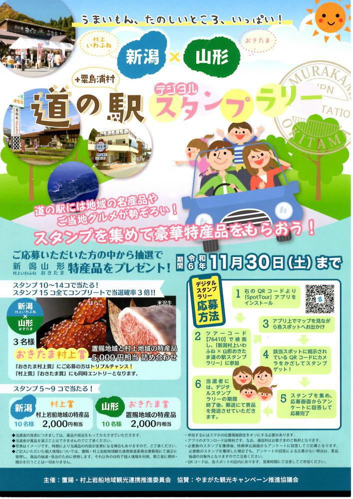 新潟 村上いわふね×山形おきたま「道の駅デジタルスタンプラリー」11/30まで開催!山形県置賜地域及び新潟県村上・岩船地域などの15の道の駅でデジタルスタンプラリーを実施中です!道の駅には地域の名産品やご当地グルメが勢ぞろい!スタンプを集めて豪華特産品をもらおう!パンフレット [PDFファイル/18.64MB]◇期 間 2024年8月9日(金)〜11月30日(土)◇参加方法(1)「Spottour」アプリをインストール「Spottour」アプリリンク<外部リンク>         (2)ツアーコード【76410】で検索し、「新潟村上いわふね×山形おきたま 道の駅デジタルスタンプラリー」に参加(3)アプリ上でマップを見ながら各スポットへお出かけ(4)該当スポットに掲示されているQRコードにカメラをかざしてスタンプゲット!(5)スタンプを集め、応募画面からアンケートに回答して応募完了(6)当選者にはデジタルスタンプラリーの期間終了後、郵送にて景品を発送させていただきます。◇スタンプスポット 新潟県側のスポット 山形県側のスポット 道の駅笹川流れ(村上市) 道の駅いいで(飯豊町) 道の駅朝日(村上市) 道の駅田沢(米沢市) 道の駅神林(村上市) 道の駅白い森おぐに(小国町) 道の駅関川(関川村) 道の駅たかはた(高畠町) 道の駅胎内(胎内市) 道の駅白鷹ヤナ公園(白鷹町) 道の駅加治川(新発田市)    道の駅川のみなと長井(長井市) 道の駅あがの(阿賀野市) 道の駅米沢(米沢市) 粟島浦村 ◇賞 品1 村上賞、おきたま賞:スタンプ5〜9コを集めて応募すると、地域の特産品2,000円相当が、抽選で20名(各賞10名)に当たります。2 おきたま村上賞:スタンプ10〜14コを集めて応募すると、両地域の特産品5,000円相当が抽選で3名に当たります。                                                                              ・「おきたま村上賞」に応募すると「村上賞」と「おきたま賞」にも同時エントリーとなります。 ・15コすべてのスタンプを集めて応募すると、「おきたま村上賞」の当選確率が3倍になります。また、「おきたま村上賞」に加え、同時応募となる「村上賞」「おきたま賞」の当選確率も3倍になります。 ◇お問い合わせ置賜・村上岩船地域観光連携推進委員会(事務局:新潟県村上地域振興局地域振興グループ)TEL:0254-52-7230