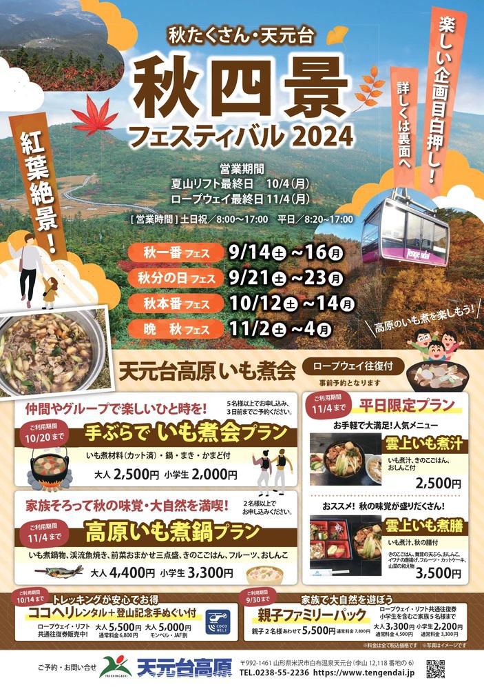 天元台高原「秋四景フェスティバル2024」9/14〜4回開催!秋の恒例企画は、期間中4回の3連休に合わせて内容を拡充して展開!「秋四景フェスティバル」としてたくさんの企画をご用意し、みなさんのお越しをお待ちしています。◇営業期間/夏山リフト最終日 10/4(月) ロープウェイ最終日11/4(月)◇営業時間/土日祝 8:00〜17:00 平日8:20〜17:00◇秋一番フェス 9/14(土)〜9/16(月・敬老の日)・米沢市民感謝の日 ロープウェイ無料/リフト特別料金 大人1,350円 小学生1,050円※市民に限らずどなたさまもご利用できます。◇秋分の日フェス 9/21(土)〜9/23(月・秋分の日)・雲上打ち上げ花火&サンセットクルージング◇秋本番フェス 10/12(土)〜10/14(月・体育の日)・西吾妻山縦走登山・西大巓グランデコース◇晩秋フェス 11/2(土)〜11/4(月・文化の日)・高原のパラシュート花火を大キャッチ大会※詳しいイベント内容はコチラをご覧ください。◇お問い合わせ天元台高原 TEL:0238-55-2236