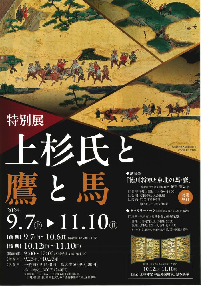 前期:9月7日(土)〜10月6日(日)後期:10月12日(土)〜11月10日(日)※展示替:10/7〜11休館日:9/25(水)、10/23(水)開館時間 9:00〜17:00(入館受付は16:30まで)国宝「上杉本洛中洛外図屏風」原本展示期間:10月12日(土)〜11月10日(日)入館料 一般800円(640円) 高校・大学生500円(400円) 小・中学生300円(240円) ( )内は20名以上の団体料金です。 お得な共通入館券米沢観るパスもございます。主 催:米沢市上杉博物館 鷹、馬と人間の付き合いは、長い歴史を持ちます。六世紀ごろの古墳から出土した鷹、そして鷹匠、馬、そして馬子をかたどったハニワは、それを知らしめてくれます。また、それらは権力者との強いつながりを示しています。以後も鷹や馬は権力と強く結びつき、その象徴的存在として歴史にその姿を刻んでいます。本展は、戦国時代から江戸時代における上杉氏を中心とした武家権力と鷹と馬との関わりをみていきます。 鷹や馬は、大名と室町幕府や豊臣政権、江戸幕府との関係のほか、大名同士の関係においても重要な役割を果たしました。鷹狩は広く武家が愛好し、乗馬は移動のみならず、戦いにおいても武家に必要とされました。そこで、鷹狩や乗馬の技術が重視され、狩猟能力にたけた鷹や、名馬が求められました。また、鷹や馬を飼育したり、けがを治療したりする技術も重視されました。 このような中で戦国時代から江戸時代には、鷹や馬を題材とした障屏画が盛んに描かれました。武家が絶対的権力を握った社会的風潮の反映ともいえます。国宝「上杉本洛中洛外図屏風」にも多様な鷹や馬の姿が描かれています。 以上のような視点から、鷹や馬を通した上杉氏の歴史の一端に触れていただきたいと思います。■ギャラリートーク(担当学芸員による展示解説)※申込不要 前期:9月7日(土)、10月5日(土) 後期:10月12日(土)、11月9日(土) ※いずれも14:00〜、企画展示室にて、要特別展入館料 担当:阿部哲人(当館学芸員)■講演会「徳川将軍と東北の馬・鷹」・日時:9月14日(土)14:00〜16:00 ・講師:兼平賢治 氏(東北学院大学文学部教授)・会場:伝国の杜2階 大会議室・定員:80名(先着)※8月14日 受付開始 聴講無料