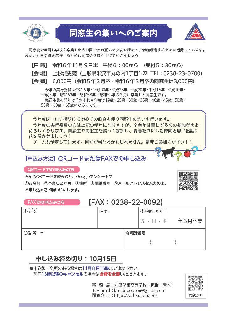 【日 時】 令和6年11月9日(土) 午後6:00から (受付5:30から)【会 場】 上杉城史苑(山形県米沢市丸の内1丁目1-22 TEL:0238-23-0700)【会 費】 6,000円(令和5年・令和6年3月卒の同窓生は3,000円)申し込みはこちら↓https://docs.google.com/forms/d/1rZHza-ScBbvrf24dBHVHlGgJnlDX0Dyu6w4GbsI4aP8/viewform?pli=1&pli=1&edit_requested=true