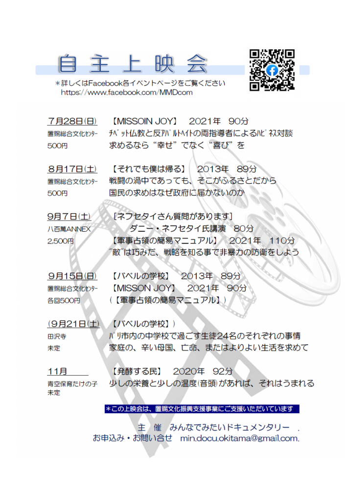 置賜総合支庁、置賜3市5町の文化行政担当部局、各市町の芸術文化協会などで組織する置賜文化フォーラムでは、置賜地域の文化振興と地域活性化を図ることを目的に、置賜地域の住民が主体となった文化事業に対し、補助金を交付しています。今年度採択された「みんなでみたいドキュメンタリー」では、ドキュメンタリー映画を通じた交流事業として、指定の期日にドキュメンタリー映画を上映いたします。9月に下記の上映を予定しておりますので、ぜひ、ご来場ください。@<映画>最初の54年間 軍事占領の簡易マニュアル※映画上映後、ダニーネフセタイ氏による講演が行われます。<上映日>令和6年9月7日(土) <場所>八百萬ANNEX<料金>2,500円A<映画>・バベルの学校・MISSON JOY<上映日>令和6年9月15日(日) <場所>置賜総合文化センター<料金>各回500円<問い合わせ>みんなでみたいドキュメンタリーmin.docu.okitama@gmail.com※詳細な時間は、下記Facebookページをご覧ください。https://www.facebook.com/MMDcom 詳細はチラシをご覧ください。