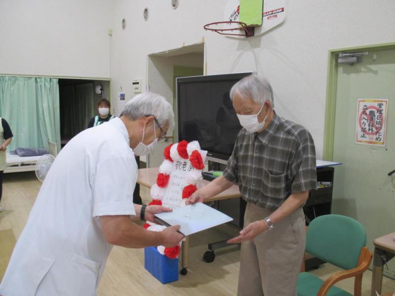 9月の18、19、20の3日間に敬老会を行いました。古希、米寿、卒寿、百二賀のお祝いの方々に職員が手作りした色紙をプレゼントしました。大変喜ばれていました。ビンゴゲームで1、2、3番目にビンゴになった人に少しばかりですがプレゼントしました。おやつの前に鏡開きをして中には・・・ノンアルコールのビールと梅酒が入ってましたー。皆で乾杯をして飲みました。