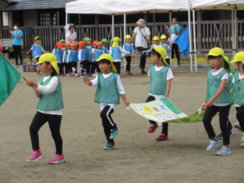 10月5日秋晴れのなか1〜5歳児クラスの子たちが参加しての運動会を開催しました。1、2歳児組は大好きなお家の方と一緒の競技で、甘えて抱っこしたり張り切って走り、ゴールテープを切っていました。幼児組は少しずつ勝ち負けにもこだわりながら競技をがんばっていました。幼児組保護者競技のつなひきではお家の方も張り切って参加していましたが、それ以上に子どもたちの大きな声援に会場は盛り上がりました。