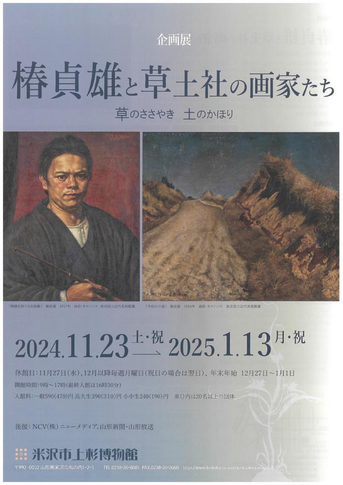 米沢市上杉博物館にて、企画展「椿貞雄と草土社の画家たち」が開催されています。米沢市出身の画家である椿貞雄の活躍や、椿氏が所属していた美術団体「草土社」について紹介します。この機会にぜひ、ご来場ください。<開催日時>令和6年11月23日(土)〜令和7年1月13日(月・祝) 9:00〜17:00休館日:11月27日(水)、12月以降毎週月曜日、12月27日〜1月1日<場所>米沢市上杉博物館<料金>一般:590円高大生:390円小中生:240円<問い合わせ>米沢市上杉博物館 TEL:0238-26-8001詳細はチラシをご覧ください。
