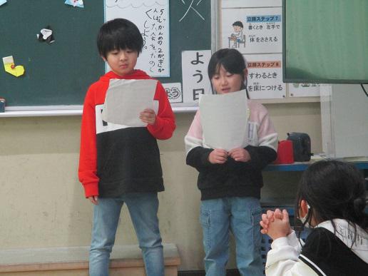 2年生、2学期がんばった会が始まりました。最初はみんなでR先生の顔を描いています。鼻、口、顔の輪郭…と一人ずつ描いていきます。似ているような… ああでもない、こうでもない・・・と話しながら、楽しそう! 3つのゲームの後、2学期がんばったことの発表です。 一人一人拍手をもらい、温か気分になりました。 日付が変わって・・・図工の時間、どんどん自分たちで準備します。 箱を使って考えたものを創ります。に〇〇肉屋さん!だそうです。生活に密着していていいね! ついでにお楽しみ会、フルーツバスケット! 伝言ゲーム。なかなか伝わらなくて、見ているほうが楽しませてもらいました! 水曜日の放課後は、毎週1階の掃除をしている1年生。ありがとう! 冬休みおさらい帳のページ確認。 次に、いつ何ページずつやるか、計画を立てます。1日20ページする人も! 札束や携帯が欲しいのね・・・。ふっふっふ! 4年生、速く正確に解こうとする気持ちが伝わってきます。頭の中がぐるぐる回転している音が聞こえてきそうでした。すばらしい! 5年生。道徳です。 ほんとうの自由とは!さあ、この時間の後から、5年生はどんな生活をするのでしょう。 6年生、今後の取り組みについて話しています。カメラを向けるとやってきたトリオ!あまりにもグー!が力強くて、学生服を着ると、もうすっかり中学生に見えるな〜と思ってしまいました。 小学校生活の集大成の時期です。悔いなく! それぞれがそれそれに・・・2日間のハイライトでした。
