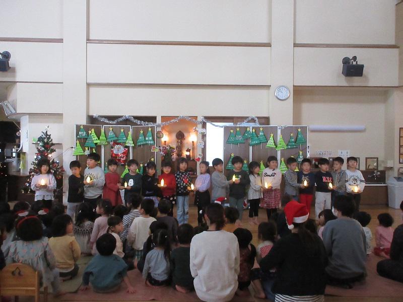 12月24日(火)にクリスマス会がありました。『きよしこの夜』に合わせて、年長児のキャンドルサービスからスタートしました。歌を歌ったり、ダンスをしたりして大盛り上がりの子ども達。職員のお楽しみでは、サンタクロースではない様々なキャラクターが登場し、本物のサンタクロースはどこ?と探すことに夢中な姿が見られました。鈴の音が鳴り、本物のサンタクロースが登場すると大喜び!クリスマスプレゼントをもらうことができ、可愛らしい笑顔で溢れていました。