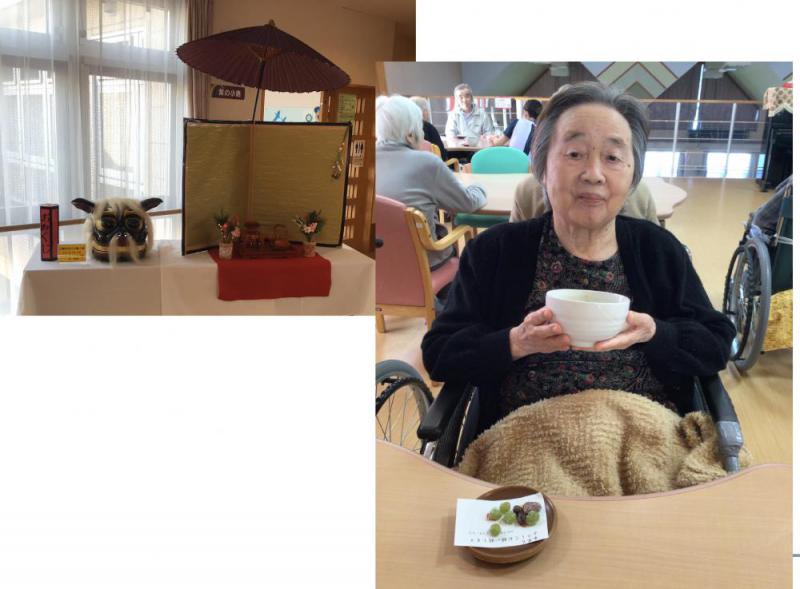 入所ではお正月の雰囲気を感じてもらおうと、お抹茶のお振舞いをしました。お正月らしく獅子頭などが飾られた広場でお抹茶と菓子を召し上がり、穏やかなお正月を迎えられておりました。