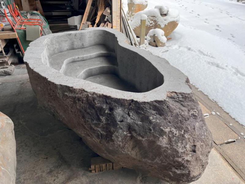 内側に2段ほど段差を付けてみました。出入りもしやすく、座って入浴しやすくなると思います。身長の低い方や足腰が弱っている方でも安心してお湯に浸かってもらえればと思います。 原料:蔵王石(安山岩)入浴可能人数(目安):1、2人展示場にて展示中 一つとして同じ表情の無い蔵王の天然石から削り出す石風呂。永い年月の中で石に蓄えられたパワーは心と身体に癒しを与えてくれます。____それはまさに自然からの贈り物。株式会社ざおうコーポレーション 石材部門では蔵王の天然石を使った石風呂を制作・販売しています。ご興味がございましたらぜひ一度展示場へお越しください。https://zao-stone.jp