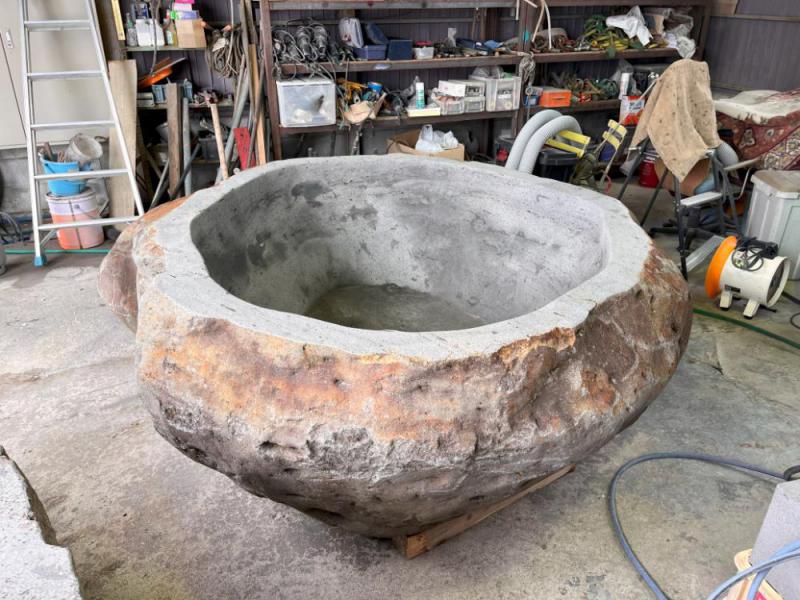 風呂の内側をお椀のように傾斜をつけて削りました。傾斜があることで入浴中に背中を付けやすくなるのでよりゆったりとお湯に浸かれると思います。全体の形はぽてっとしていて安心感を感じさせてくれます。 原料:蔵王石(安山岩)入浴可能人数(目安):1、2人展示場にて展示中 一つとして同じ表情の無い蔵王の天然石から削り出す石風呂。永い年月の中で石に蓄えられたパワーは心と身体に癒しを与えてくれます。____それはまさに自然からの贈り物。株式会社ざおうコーポレーション 石材部門では蔵王の天然石を使った石風呂を制作・販売しています。ご興味がございましたらぜひ一度展示場へお越しください。https://zao-stone.jp