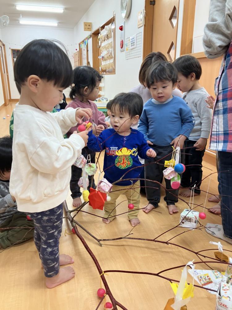 山形の小正月の行事、だんごの木飾りを行いました。幼児組の各グループともも組がだんごを丸めてゆでて、折り紙や舞玉飾りで飾られたミズキの木の枝に飾ると、花のない冬を華やかに彩るすてきなだんごの木ができました!乳児組も、ピンクと白の小麦粉粘土を保育者と一緒に丸めたりつぶしたりちぎったりしてあそび、だんごづくりのイメージで楽しみました。2階のホールと玄関ホールに飾ってあります♪