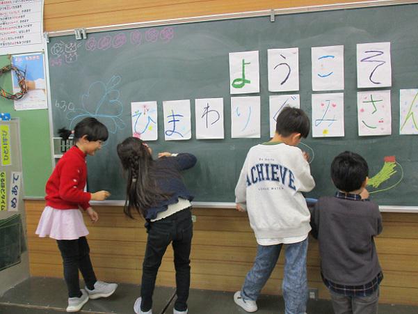 1月22日(水)、次年度入学予定の子供たちと保護者の皆様をお迎えし、入学説明会・一日入学を実施しました。保護者の方に入学までの準備や入学後の学校生活等について話をしている間、園児たちは現1年生との交流を楽しみました。17名の入学予定者を迎えるために、7名の先輩たちが張り切って準備し、可愛らしい後輩たちを温かく迎え入れました。 教室では、小学校での学習や生活について、自分たちの経験をもとに発表しました。タブレットを活用したり、インタビューを交えたりしながら、分かりやすく工夫して伝えていました。 体育館では、「だるまさんがころんだ」や「じゃんけんリレー」などで体を動かしながらたっぷり触れ合いました。体育館中に歓声が響き渡り、大いに盛り上がりました。 最後に、生活科で育てた朝顔から採取した種にメッセージを添え、心を込めてプレゼントしました。優しい先輩たちは、4月の入学式の日を心待ちにしています。ひまわり組のみなさん、みんな楽しみに待ってるよ!