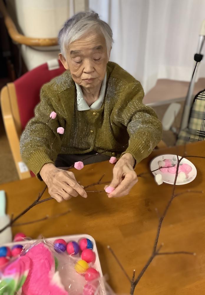 1月28日(火)、利用者様と職員で今年1年の無病息災を願い団子の木飾りを行いました。利用者様からは「綺麗に飾り付け出来て良かった!」「とても楽しかった!」「花の里に入ってとても良かった!」等の言葉が聞かれ、大変喜んでおられました。